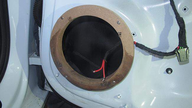 中低音安装在原车喇叭位,,安装过程,需要注意以下几点:①喇叭垫圈需要防水,②搭配防水罩安装③喇叭线需用网管进行保护,线端也用不同颜色的热缩管进行保护区分④分音器固定在门板上时不得阻挡门板的安装
