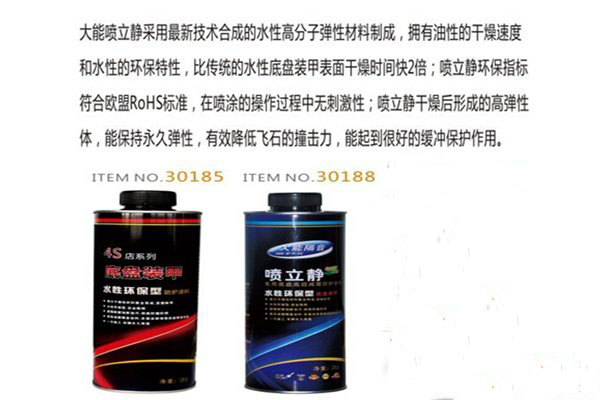 在车辆底盘、轮毂、邮箱、汽车下围板、行李箱等暴漏部位,形成一层牢固的弹性保护层,行驶过程中飞石和沙砾的撞击、轮胎摩擦声被阻隔,潮气、酸雨、盐分对车底盘不再形成侵蚀,确保10年不锈穿,大大提升行车安全和汽车价值。
